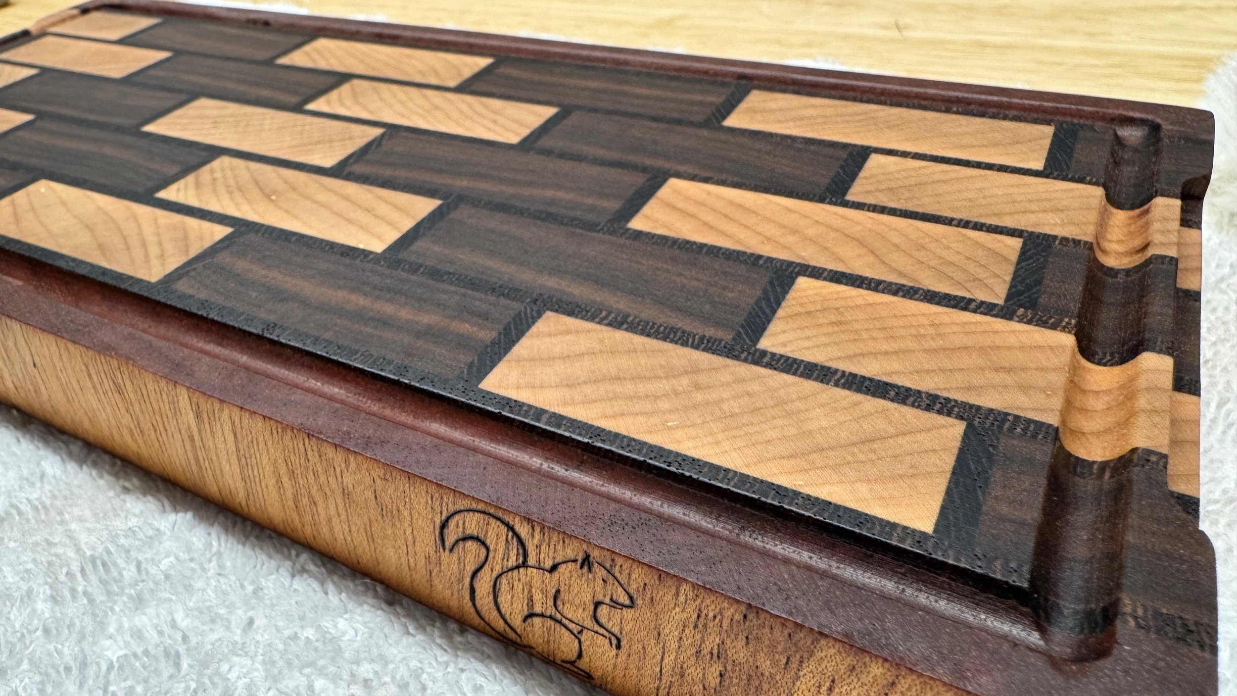An end grain cutting board made of walnut, maple, wenge and mahogony.